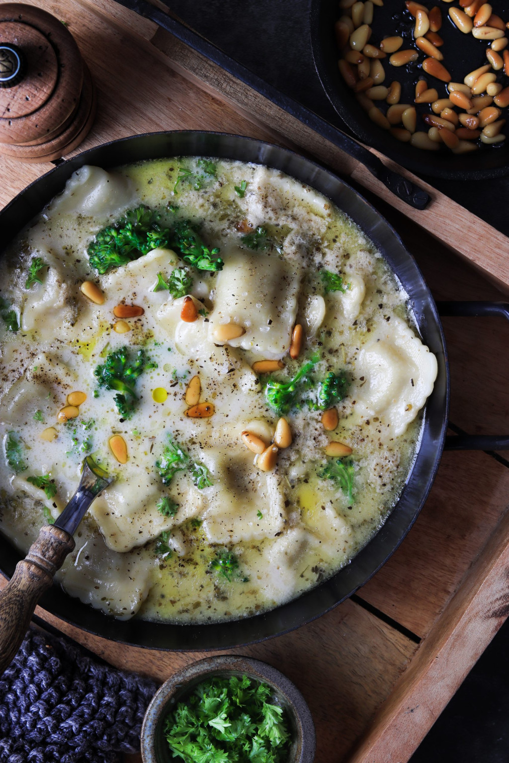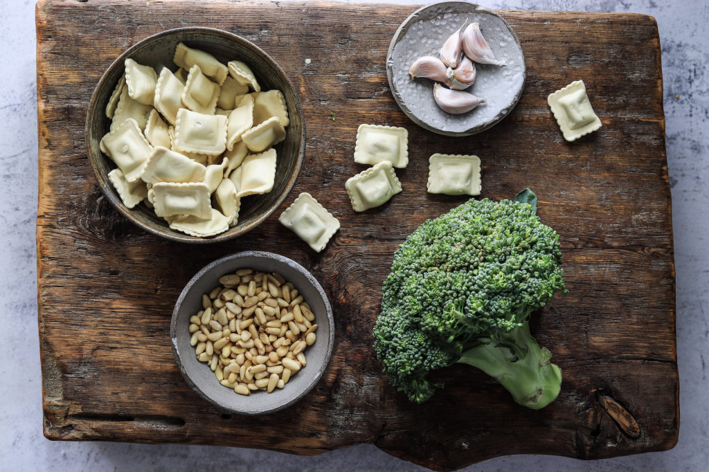 Zu deiner Zutatenliste gehören 250g convenient Ravioli. Industriell hergestellte Produkte sind nämlich nicht immer böse und in diesem Fall wollen wir einfach mal durch Schnelligkeit bestechen. Des Weiteren darf Knofi nicht fehlen und wir suchen uns im Bioladen einen knackig-grünen Brokkoli. Für das Topping wählen wir frische Petersilie und Pinienkerne, welche wir in der Pfanne, mit etwas Öl, knusprig-braun braten.