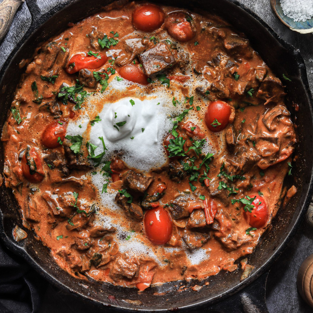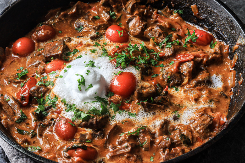 Erhitze Olivenöl in einer tiefen Pfanne und brate den Knoblauch und die Zwiebeln, in Tomatenmark, Paprikapulver, Korianderpulver scharf an.