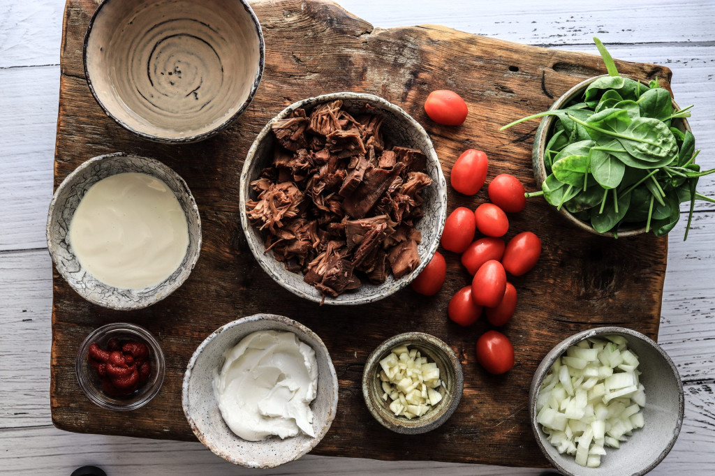 Würze mit frischem Pfeffer und Meersalz und gib die Jackfruit, sowie die Sojasahne und den Frischkäse hinzu. Koche alles auf kleiner Flamme 15 Min.