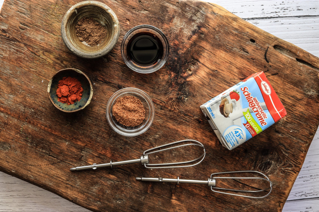 Wir verwenden etwas frische Petersilie (gern auch Koriander) und vegane Schlagsahne.
