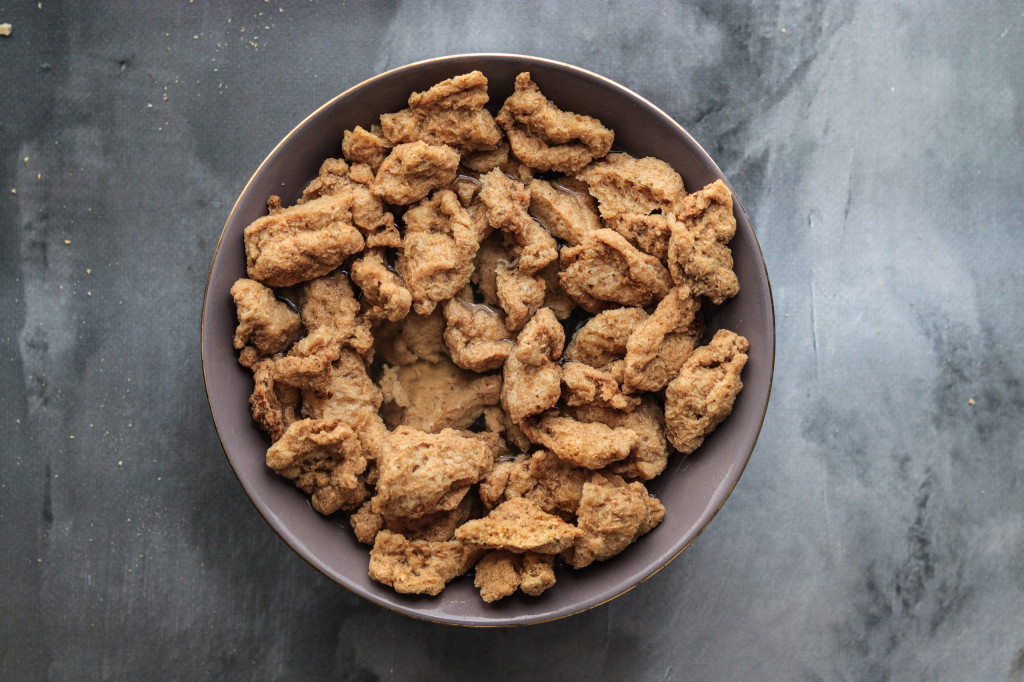 TVP wird übrigens fast immer eingeweicht, bevor es an die eigentliche Zubereitung geht. Das macht ihr entweder mit Wasser oder Brühe. Hat es sich komplett mit der Flüssigkeit vollgesogen, müsst ihr es ordentlich auspressen. Hier macht sich die gute, alte Faust ganz prima.