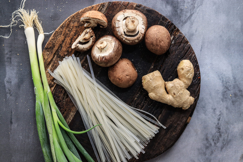 Gib das Granulat und die Frühlingszwiebeln zu den Pilzen und giesse die Sosse hinzu. Gib auch die Nudeln in den Wok und serviere alles mit Sesam und frischem Koriander (Optional)