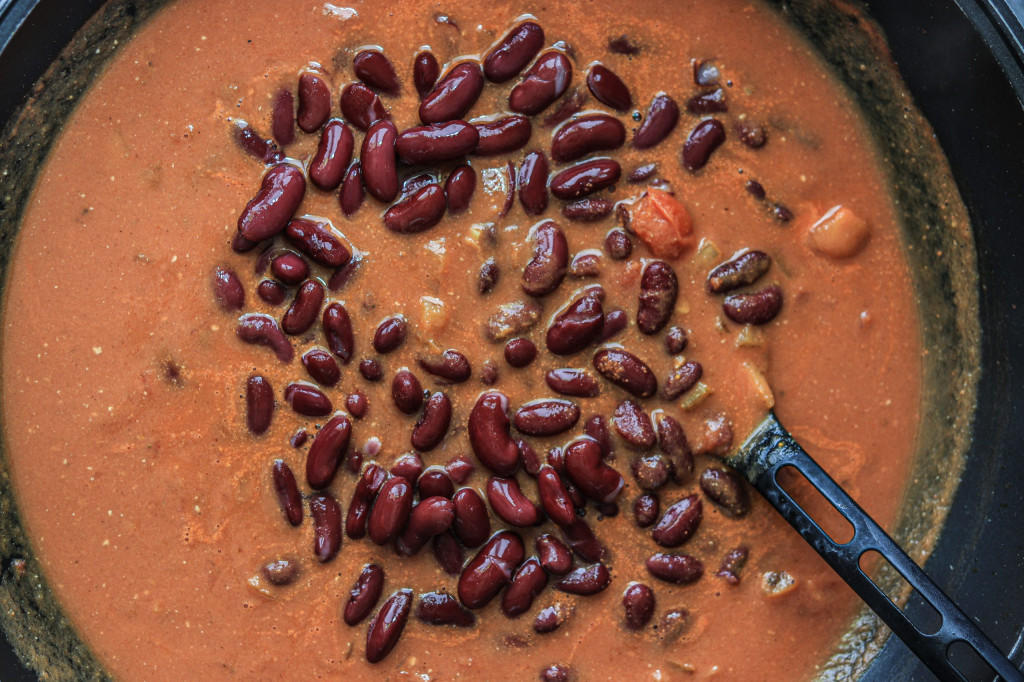 Bevor wir 25 min einkochen giesst ihr etwas Wasser auf, gebt abgetropfte Kidneybohnen (Dose) hinzu, presst den Saft einer Limette hinein und rührt Ahornsirup unter. Reguliert die Flamme etwas runter und lasst das fröhliche Blubbern beginnen.