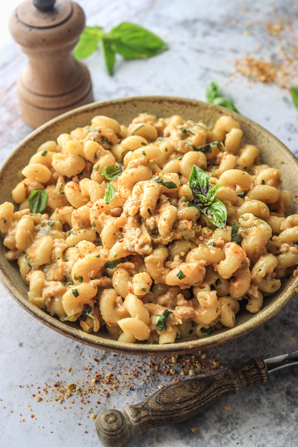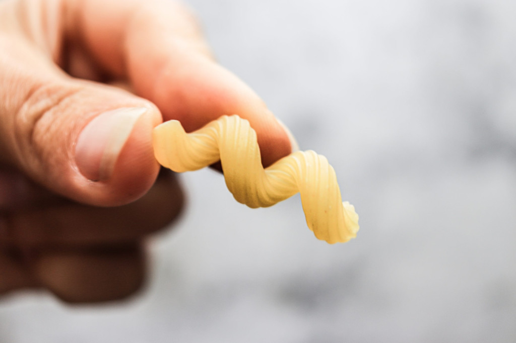 Welche Pasta ihr am Ende wählt, ist euch überlassen. Ich verwende Cellentani, weil ich die noch zu Hause hatte. Wir haben das Gericht aber auch schonmal mit Spaghetties gemacht. Allerdings solltet ihr bei herkömmlicher Weizen Pasta bleiben, da diese auf die Flüssigkeitsmengen im Rezept abgestimmt ist. Wenn ihr beispielsweise Dinkelpasta verwendet, hat diese A – eine kürzere Kochzeit und B – eine andere Quellfähigkeit.