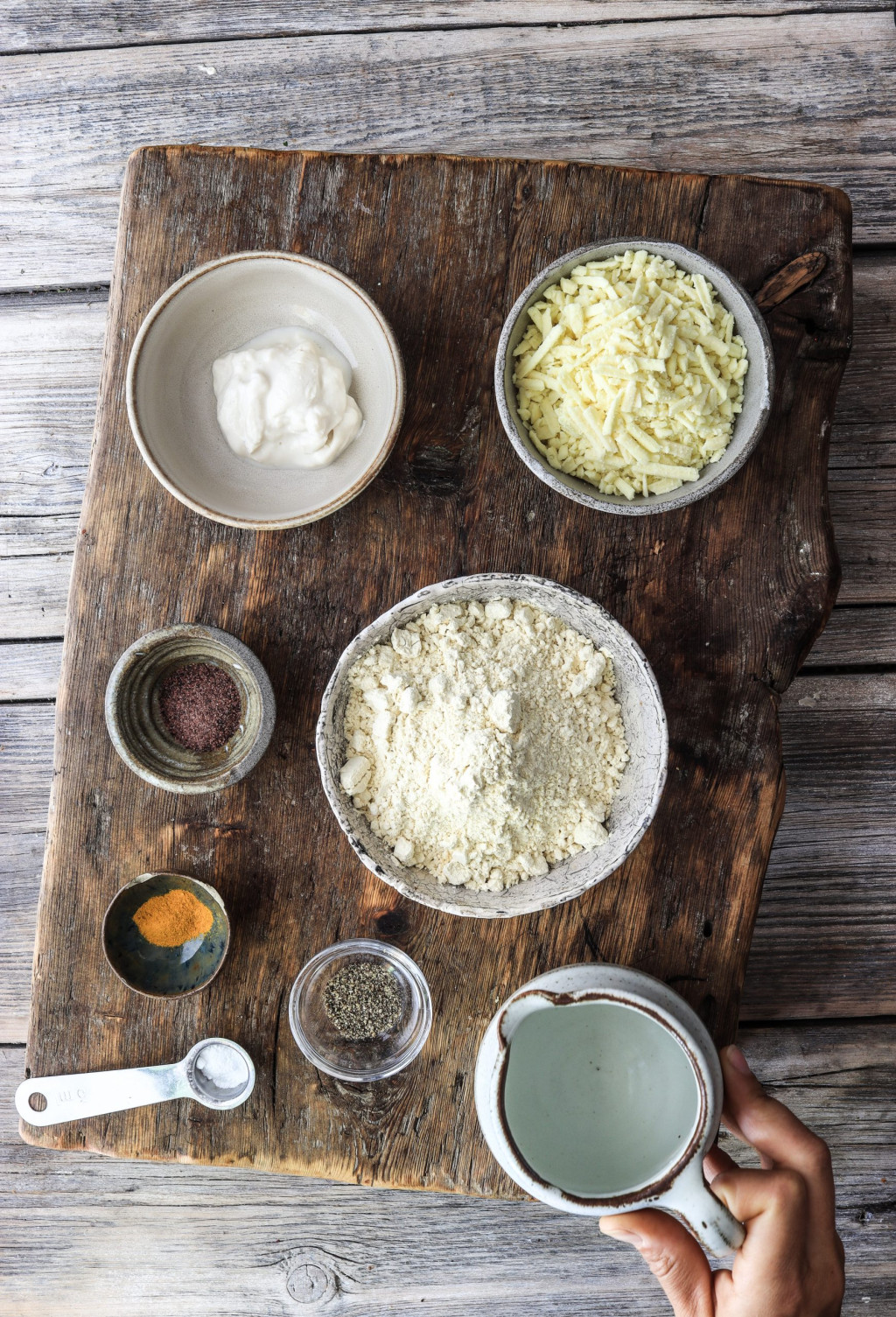 Ein klassisches Bauernfrühstück besteht ja bekanntlich aus Ei, dieses bindet unser leckeres Gemüse und hält die oberaus köstliche Masse zusammen. In unserem Fall habe ich an einer veganen Variante herumexperimentiert und bin am Ende zu einem oberaus, gut funktionierendem Rezept gelangt. Aus Kichererbsenmehl, Backpulver, veganem Quark, Kala Namak, Kurkuma und Wasser zaubern wir Ei. Unsere Zutaten werden einfach mit einem Schneebesen vermengt und anschliessend wird etwas veganer, Streukäse untergehoben. Schon ist sie küchenfertig.