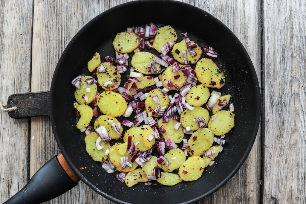 Des Weiteren kochen wir 400 g Kartoffeln, schälen diese und schneiden sie in Scheiben. Wir braten sie in pflanzlichem Schmalz an und geben nach etwa 5 Minuten eine Zwiebel, sowie unsere Paprika hinzu. Würzt das Ganze mit Paprikapulver, etwas Muskat und Salz, sowie Pfeffer. Eigentlich sind wir an diesem Punkt schon fast fertig.