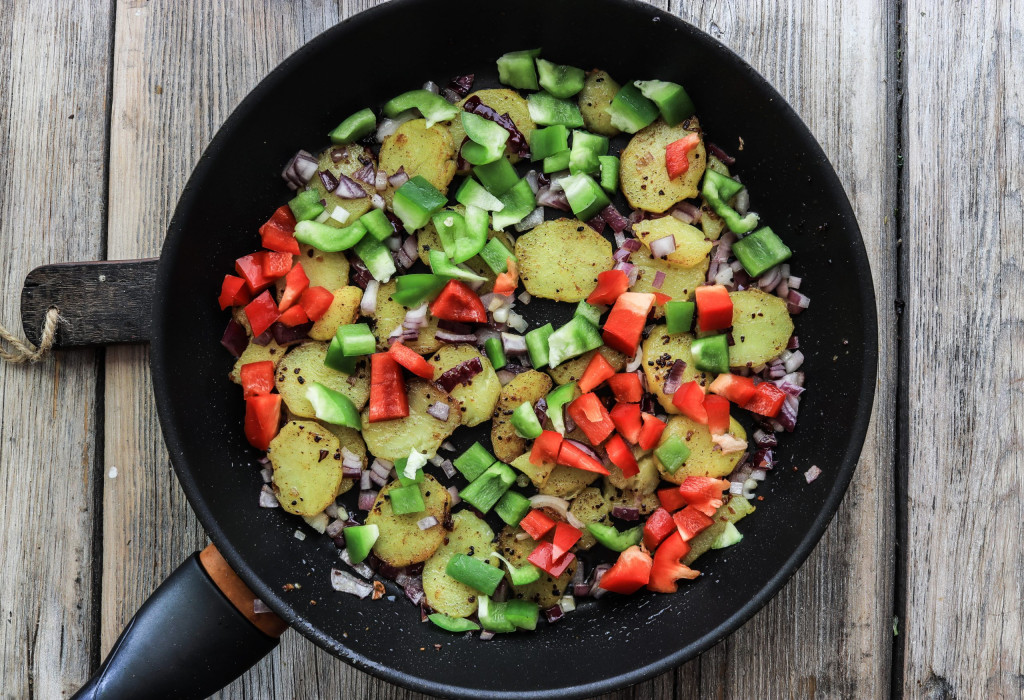 Nachdem ihr die Kartoffeln und die Paprika gebraten habt, (das Ganze sollte ca. 10 Min Zeit in Anspruch nehmen) gebt ihr die Kichererbsenmasse in die Pfanne. Achtet darauf sie gleichmässig zu verteilen. Sie sollte das Gemüse an jeder Stelle zusammenhalten.