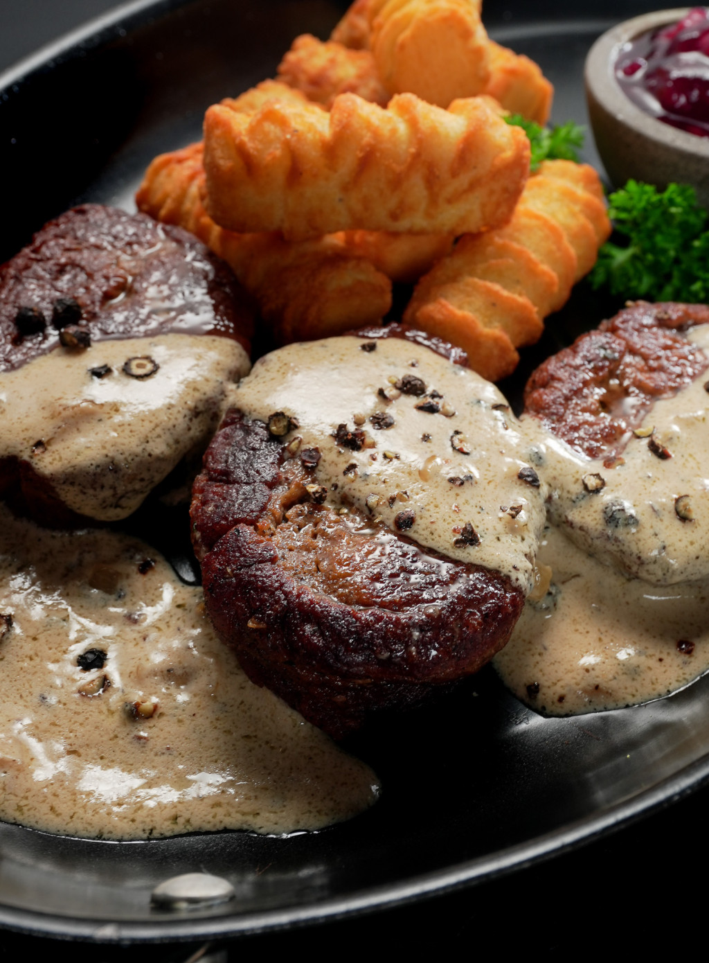 Für die Steaks in fünf gleich große (etwa 2cm dicke) Stücke teilen und leicht platt drücken. 2-4 EL Olivenöl erhitzen und scharf anbraten, bis sie bräunen. Mit 400 ml Brühe übergießen und 30 Min kochen. Steaks heraussnehmen und ganz wichtig: Abkühlen lassen