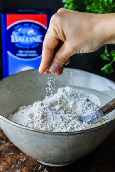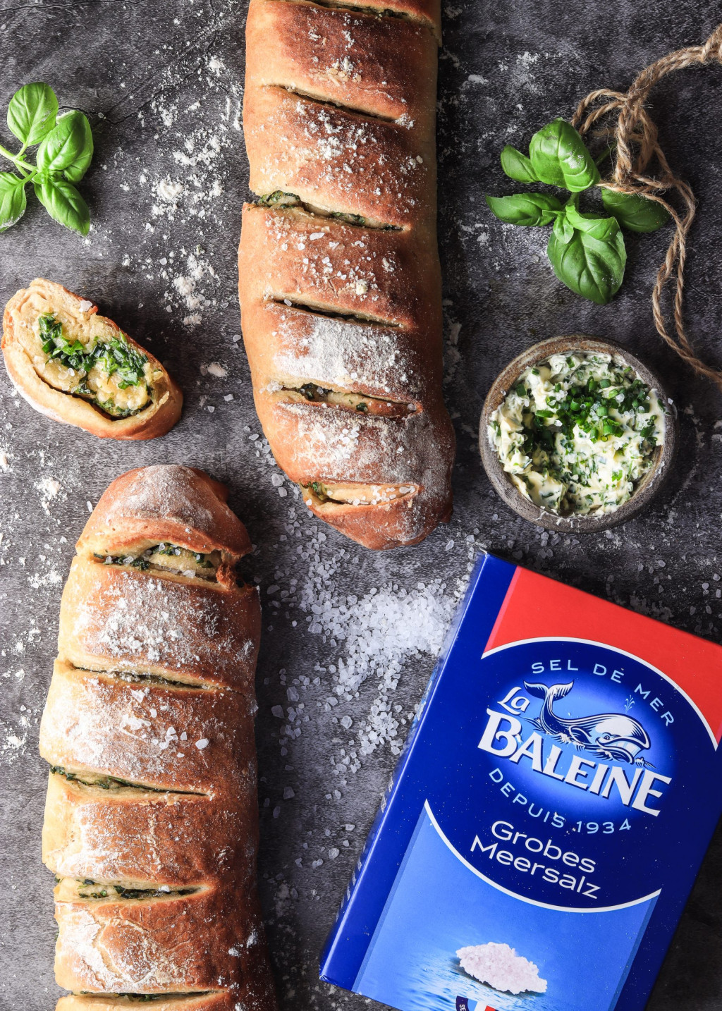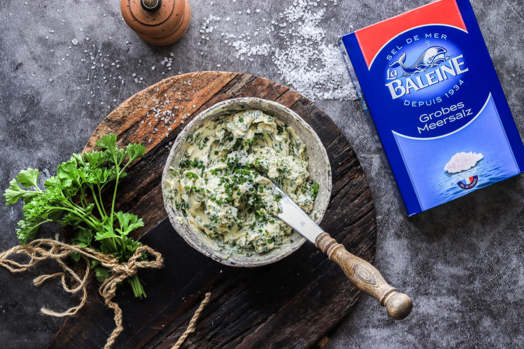 Ich habe mich für das grobe Meersalz von La Baleine entschieden, da sich die Kristalle langsamer als feines Salz auflösen und somit die Aromen des Baguettes und der Kräuterbutter intensiv hervorheben. Beim Kauf achte ich zudem darauf, dass Meersalz in einer Kartonverpackung und nicht in Plastikfolie verpackt ist. Man kann das grobe Meersalz übrigens auch perfekt in eine Salzmühle umfüllen, dann sieht es sehr schön auf dem Tisch aus.