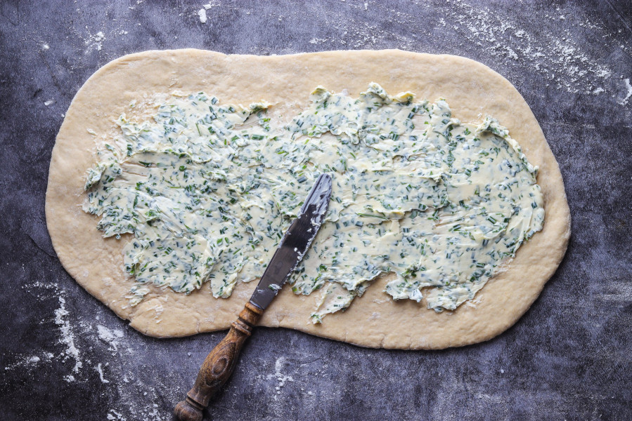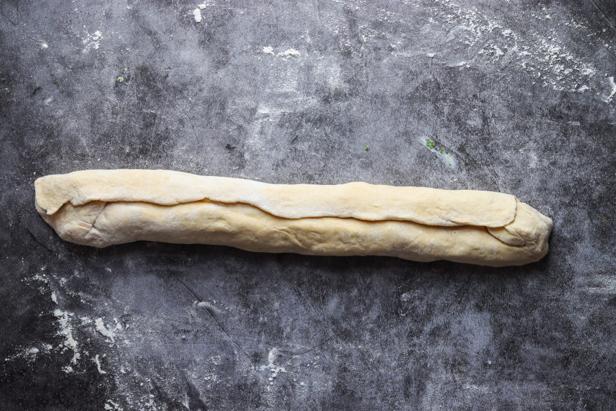 Nun verteilst du die Butter mittig auf deinem Fladen und rollst sie ein. Drücke die Enden ebenfalls zusammen und platziere das Baguette mit den überlappten Seiten nach unten auf dem Backblech. Bemehle das Baguette und schneide es an der Oberseite 6x ein. (Siehe Bildanleitung weiter oben)
