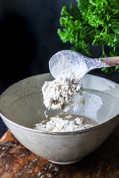 Gib das Mehl, Essig und Salz hinzu und knete den Teig für etwa 5 Min, bis er geschmeidig wird. Gib ihn in eine Schüssel und bedecke sie mit einem Handtuch. Lass den Teig auf der Heizung 30min-60min gehen.