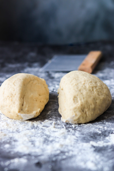Nun teilst du den Teig in zwei und rollst sie jeweils zu 20cmx30cm Teigfladen aus (ca. 1cm dick)