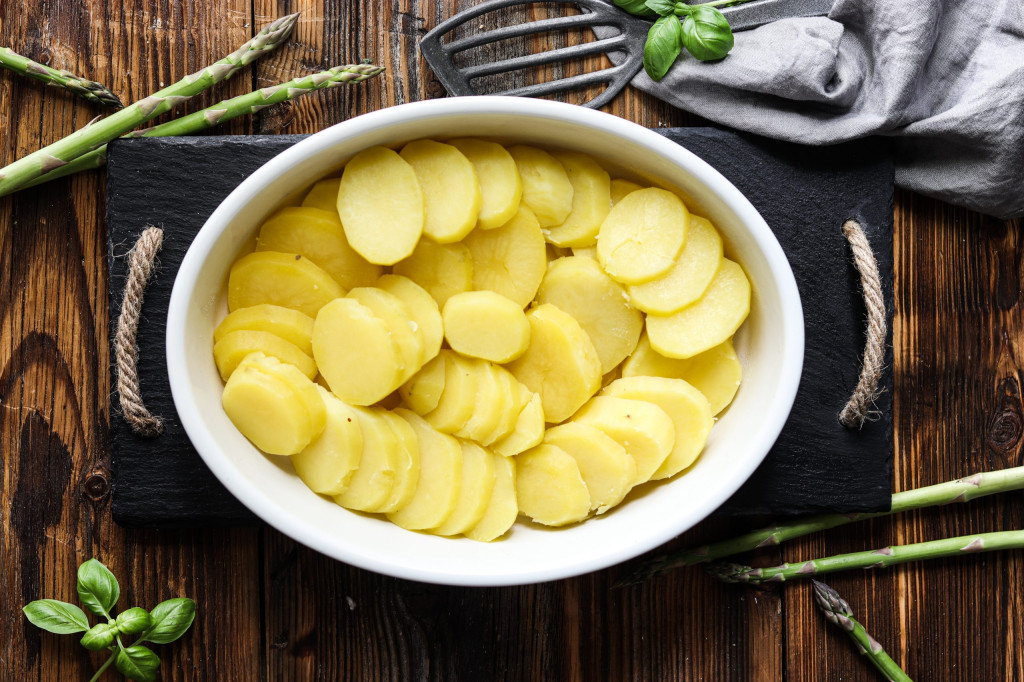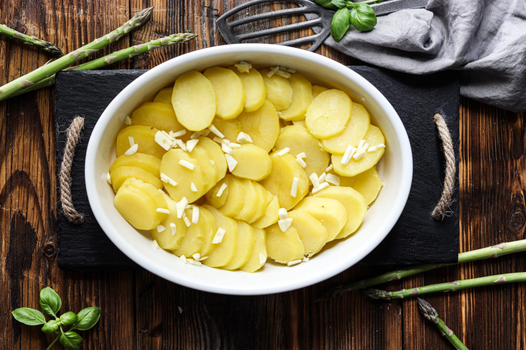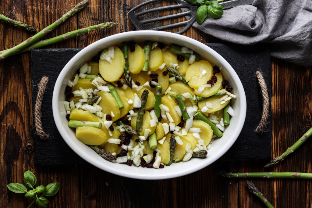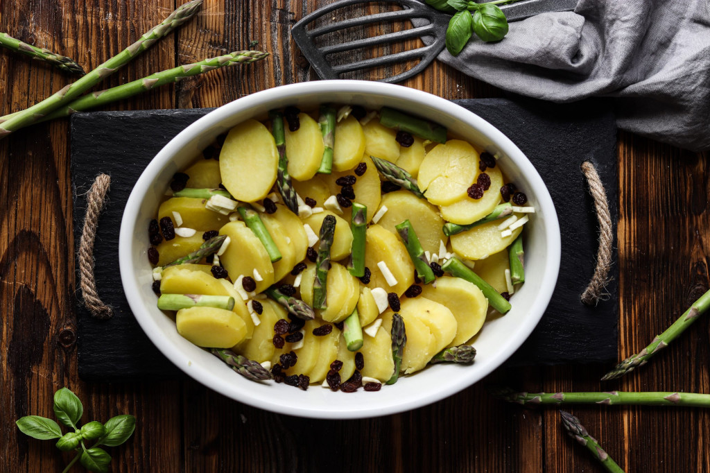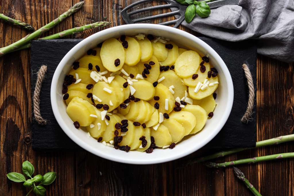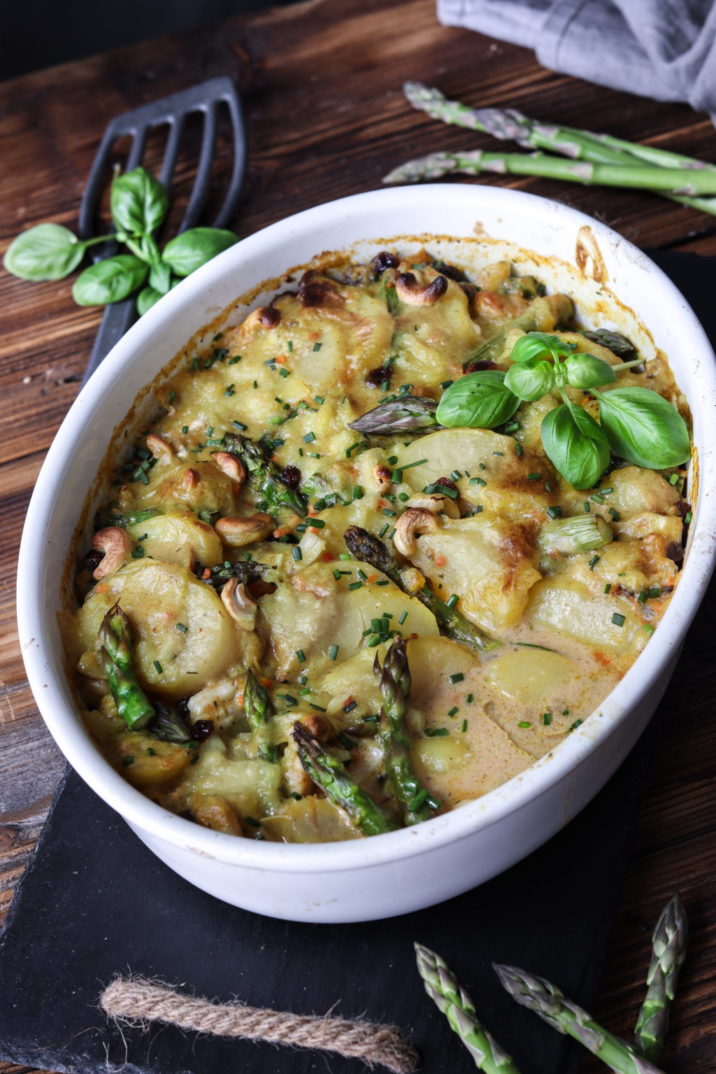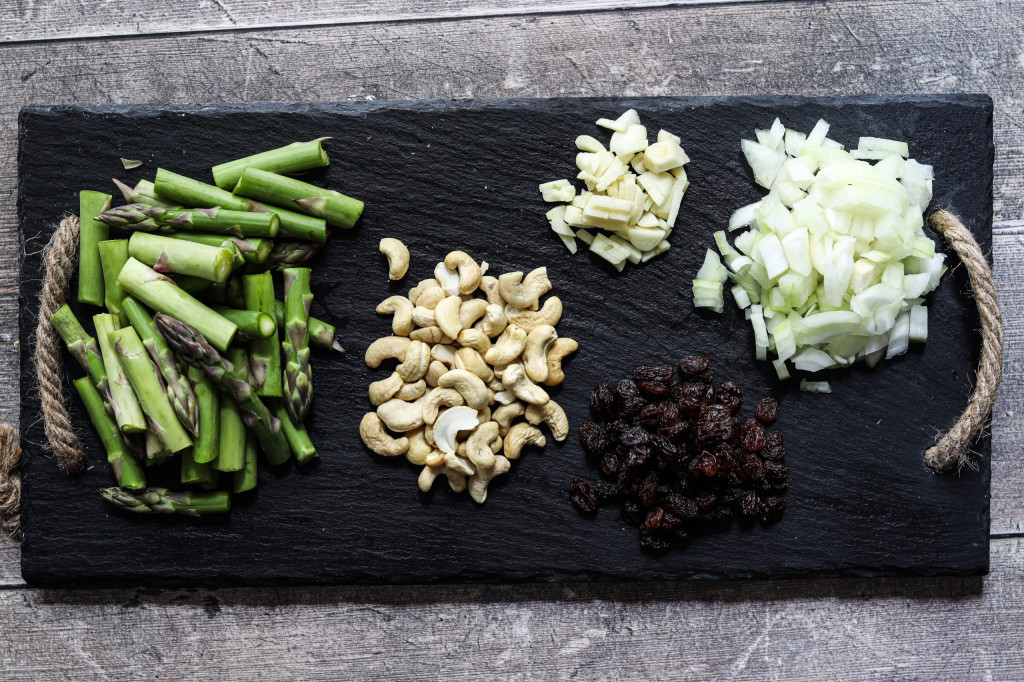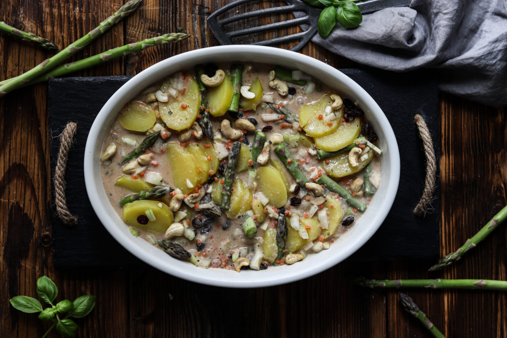 Schichte erst die vorgekochten Kartoffeln in Scheiben, dann den Spargel, den gehackten Knoblauch, die gehackte Zwiebel, Rosinen und Cashews in eine Auflaufform.