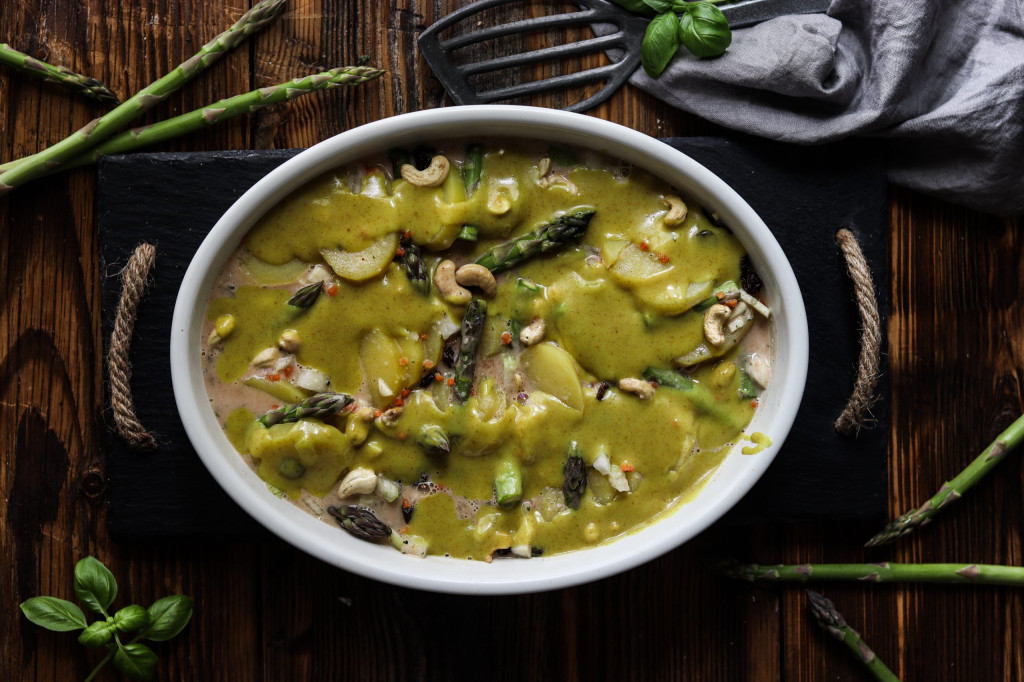 Nachdem ihr die Enden des Spargels abgeschnitten habt, drittelt ihr ihn und gebt ihn ebenfalls in die Form. Hackt die Zwiebel und verteilt sie gleichmässig auf den Kartoffeln. Nun die knackigen Cashews, welche übrigens bei einem verhältnismässig niedrigem Fettgehalt, einen hohen Anteil an ungesättigten Fettsäuren liefern und sich so positiv auf den Cholesterinspiegel auswirken.