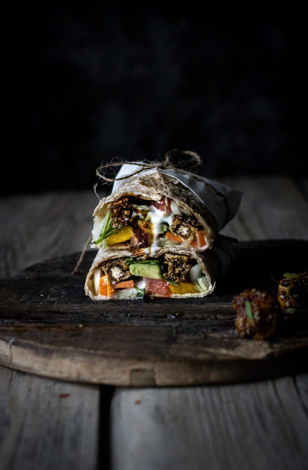 Vermenge alle Zutaten für den Dip und träufle ihn über deinen Wrap. Klappe die Seiten um und rolle ihn ein. Nun kannst du die Enden in Brotpapier einrollen und sie mit einer Schnur zusammenbinden. Halbiere den Wrap und GENIEssE…