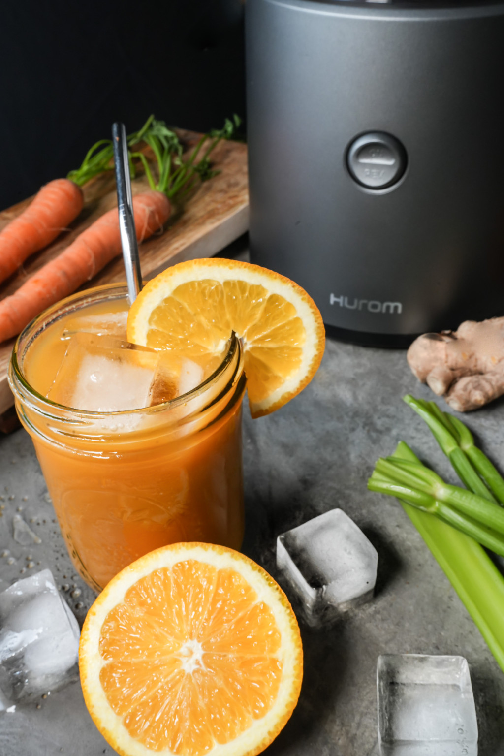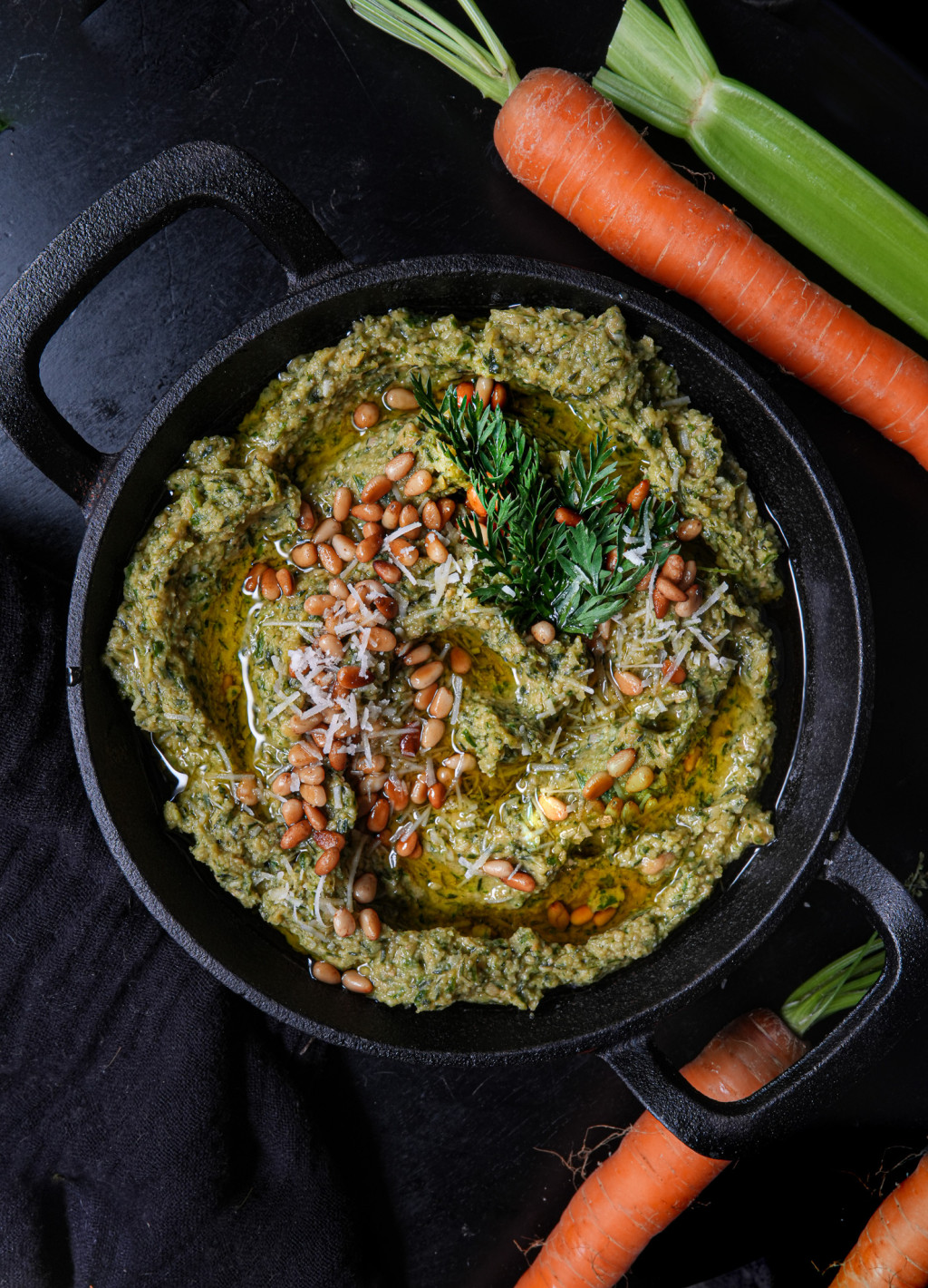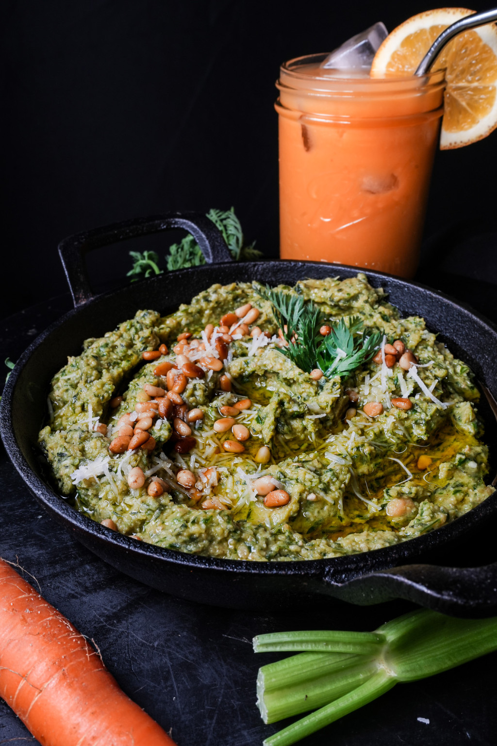 Wir machen heute einen meiner Lieblings Säfte. Aus vitaminreichen Karotten, knackigem Sellerie, fruchtiger Orange und der zarten Schärfe von Ingwer. Und weil das Karotten/Selleriegrün einfach so unglaublich schmackhaft ist, zaubern wir daraus ein mega cremiges, endlos-köstliches Pesto-Hummus mit gerösteten Pinienkernen und veganem Parmesan.