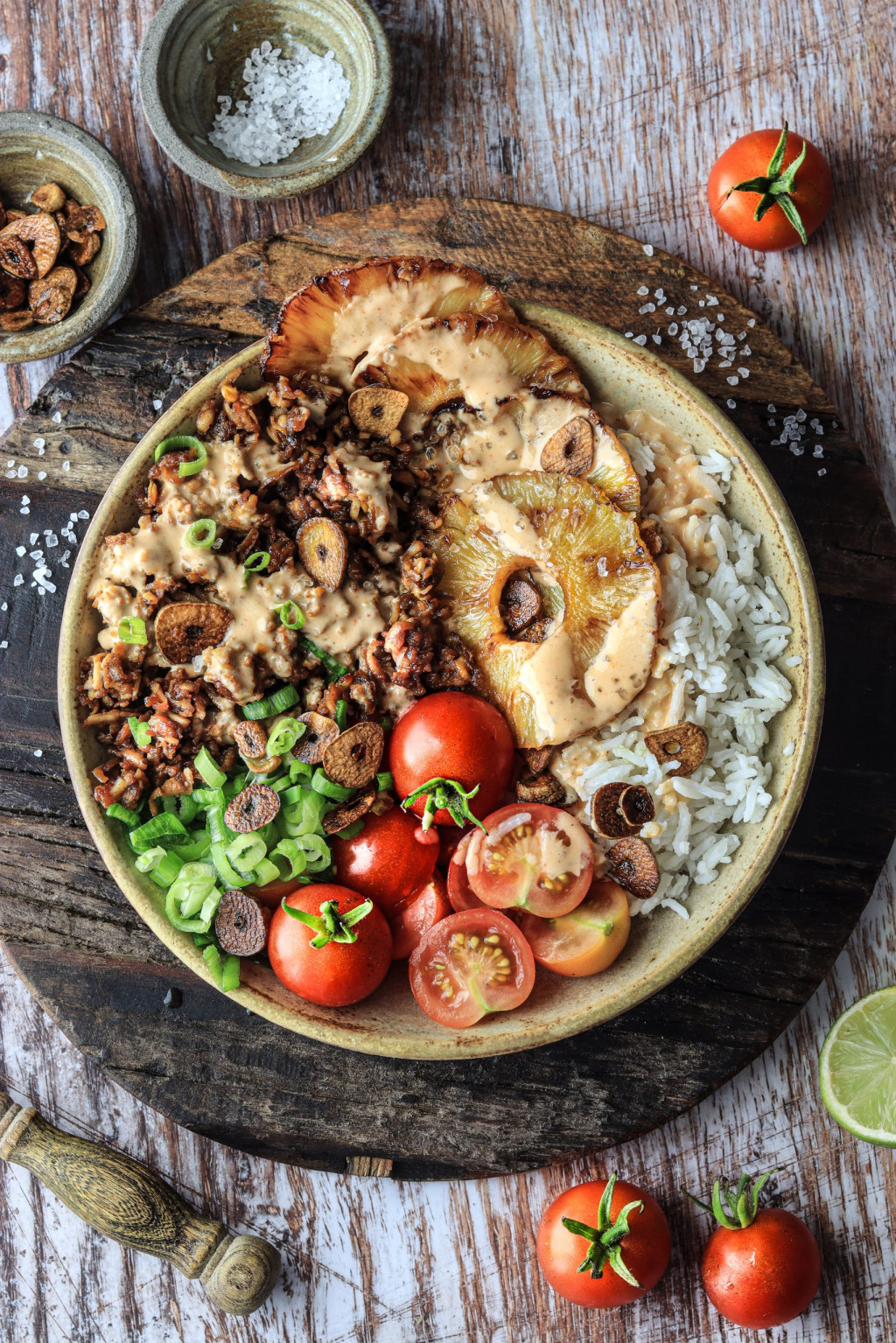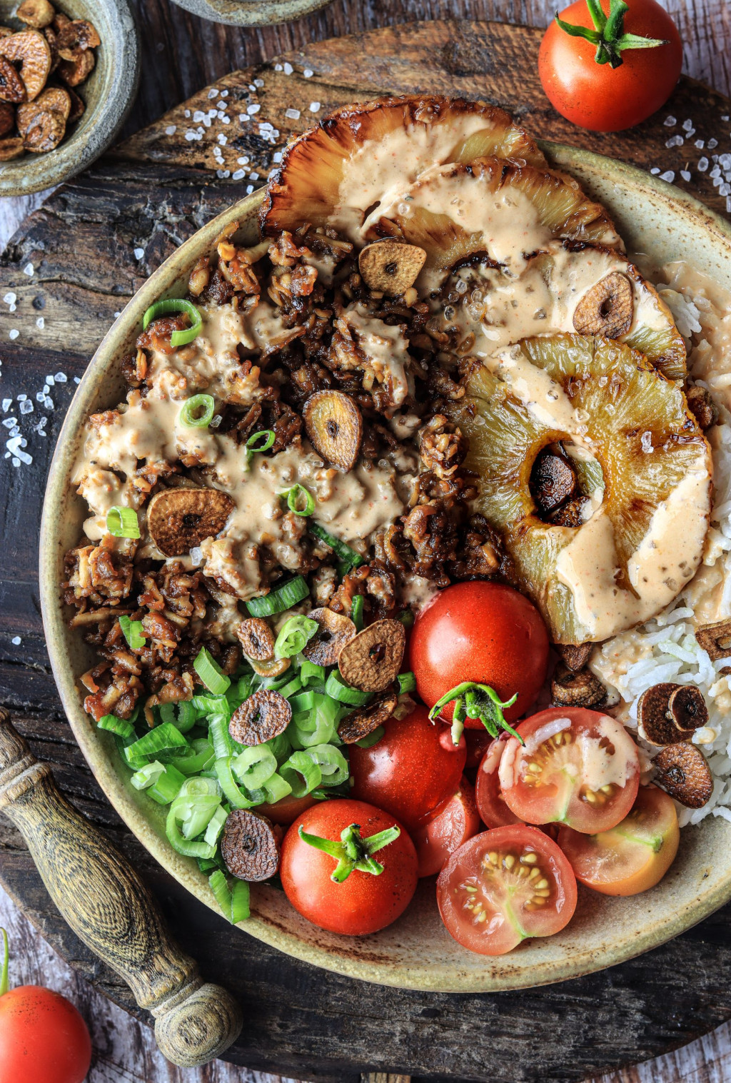 Was kann es schöneres geben, als gegrillte Ananas mit knsuprigem, pulled Tofu als Fleischersatz? Das ganze in einer ausgewogenen Bowl mit Basmati, knackigen Tomaten und einem Hot&Spicy Sriracha-Tahin Dip.Schnell, einfach, vegan und gesund.