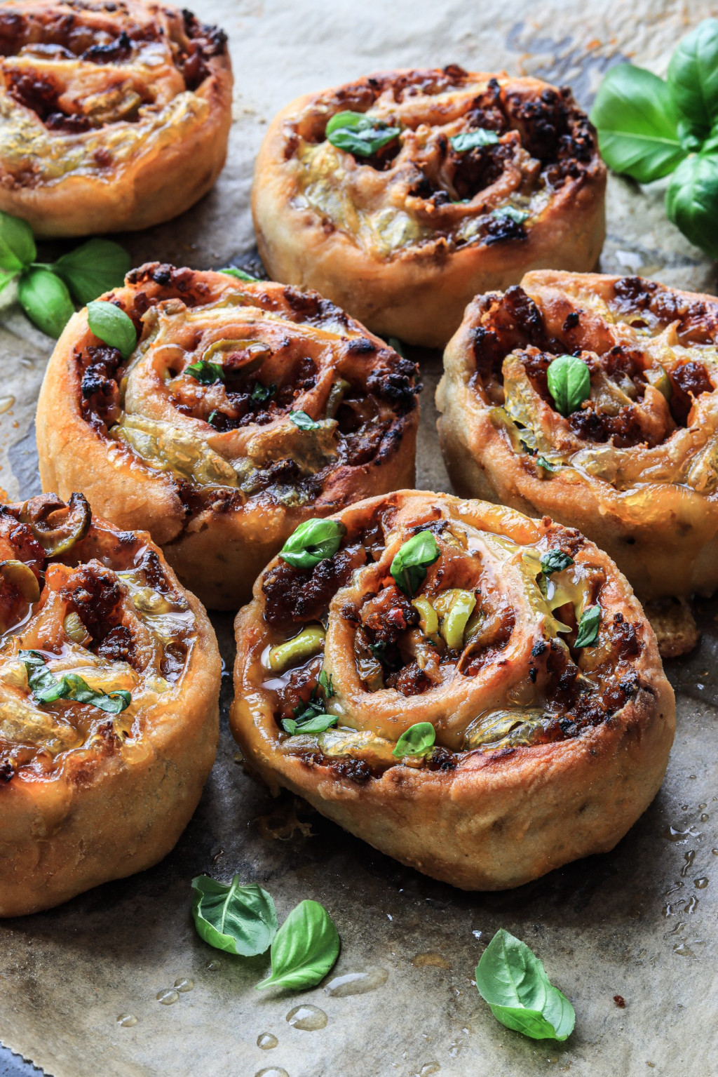 Lust auf selbstgemachte Pizza Buns mit veganer Hack-Käse Füllung?Der Teig besteht aus 5 Zutaten und ist in 10 Min zubereitet. Für die Füllung verwenden wir scharfes Tomatenmark, veganes Hack und würzige Oliven.