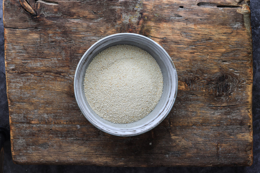 Anschliessend arbeiten wir mit herkömmliche Paniermehl. Natürlich ist es möglich altes oder übriggebliebenes Brot zu mahlen und dieses zum Panieren zunehmen. In unserem Fall war dies nicht der Fall.