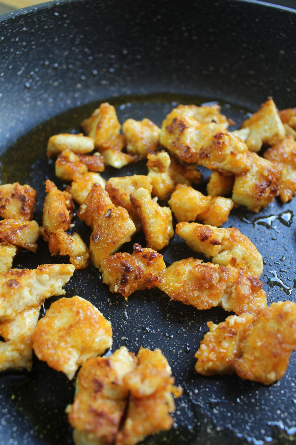 Erhitzte Olivenöl in einer Pfanne und brate den Tofu solange an, bis er goldbraun bräunt.