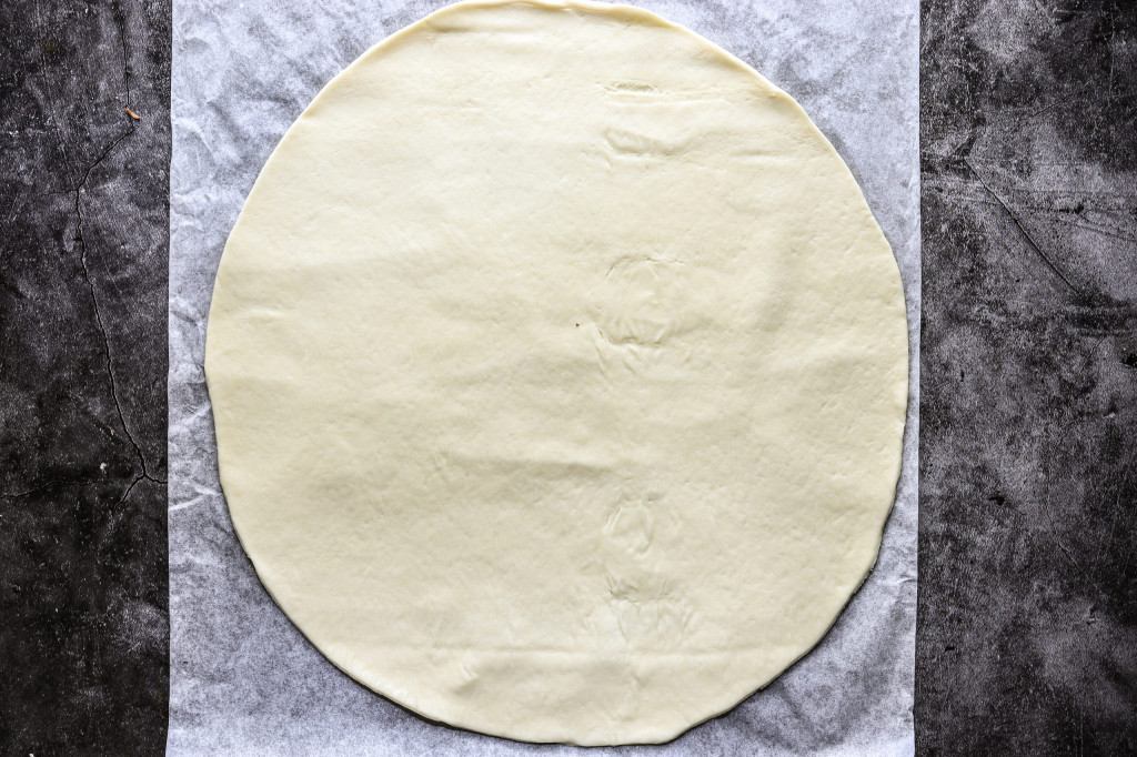 Leg ein zugeschnittenes Backpapier in eine 30cm Tart Form und leg den Blätterteig aus, so dass die Seiten ebenfalls bedeckt sind