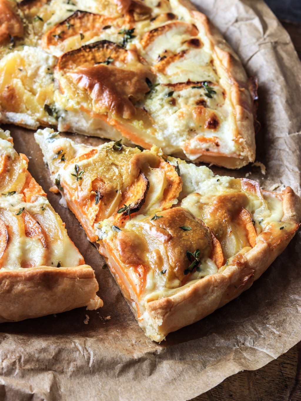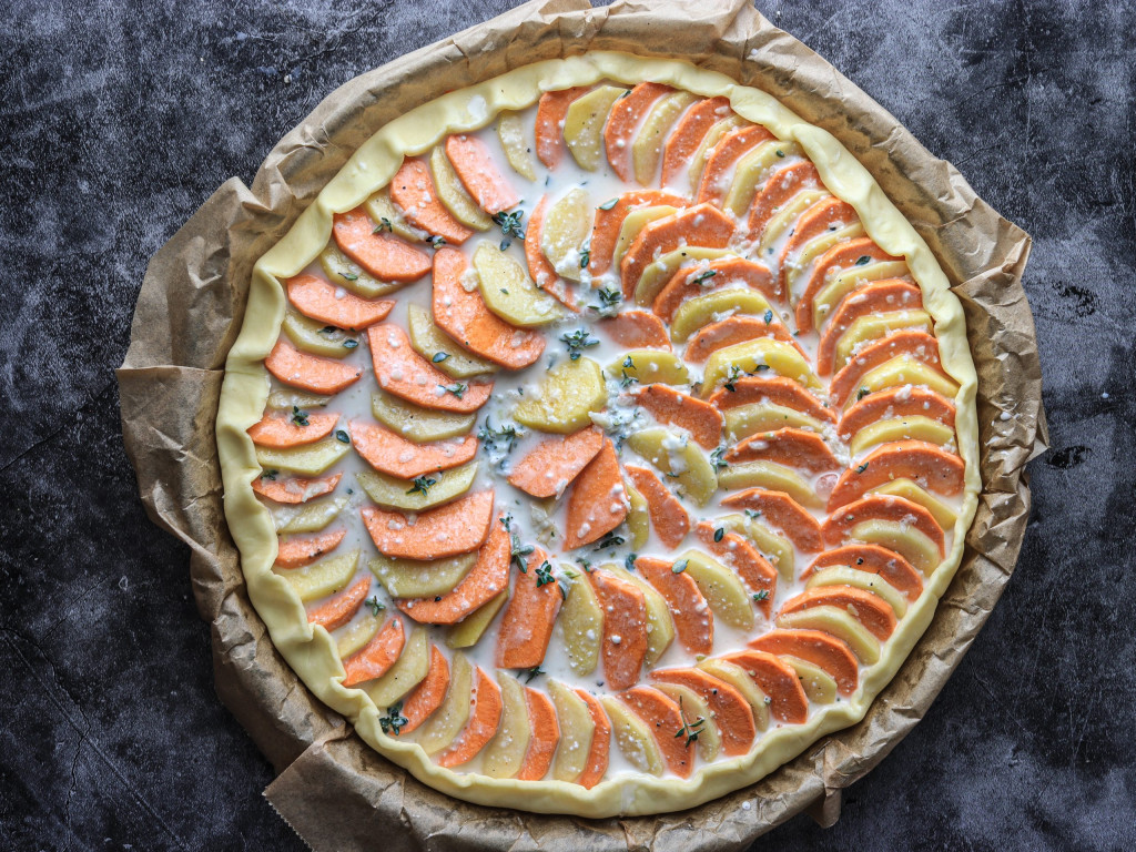 Gelingsicherheit und maximales Geschmackserlebnis. Das ist wohl die passendste Beschreibung für das heutige Rezept. Unsere Kartoffel-Süsskartoffeltart mit frischem Thymian und cremiger, veganer Sahnesosse ist denkbar simpel zubereitet.