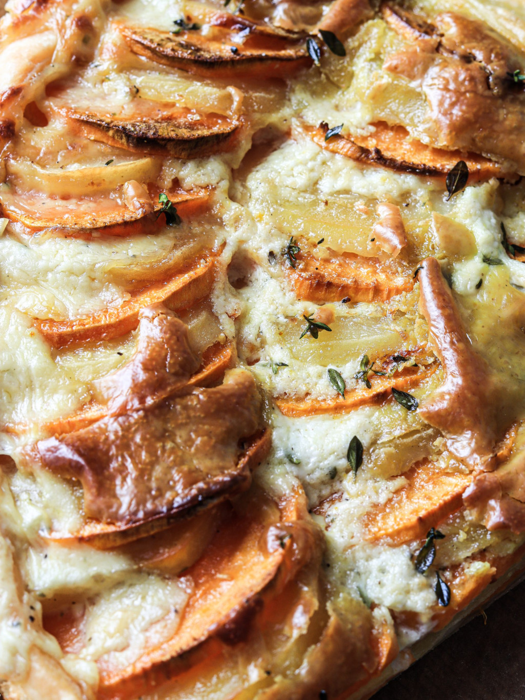 die Blätter haben sich in allen möglichen Farben gefärbt und schweben von den Bäumen. Wir haben 12°C und die Sonne scheint in mein Küchenfenster. Auf der Arbeitsfläche meiner Küchenzeile steht eine Tarteform. Die Oberfläche brutzelt und schlägt noch kleine Bläschen. Es duftet herbstlich nach Knollengemüse. Denn die Tarte ist mit Kartoffeln aus meinem Garten gefüllt. Klassische Kartoffel und rotgefärbte Süsskartoffel wechseln sich ab. Sie schwimmen in einer hellen Sahnesosse aus Soja Cuisine und frischem Thymian.