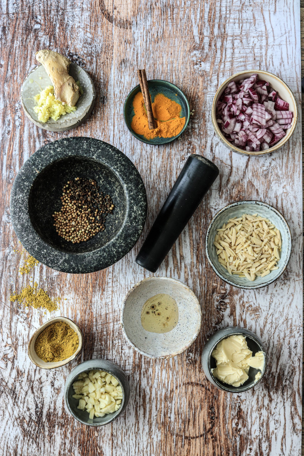 In einem Topf erhitzt du nun die vegane Butter und brätst die Zwiebel, Mandelstifte, Zimtstange den Knoblauch, Ingwer und die Gewürze für die Sosse scharf an.
