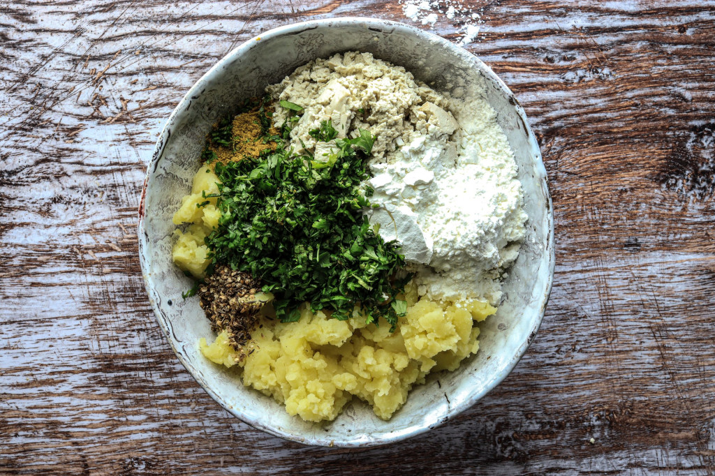 1. . . . ist in erster Linie, dass ich mich gegen die aufwendige Zubereitung von Paneer entschieden habe. Dafür benutzen wir Tofu, welcher sich ähnlich seidig unter die Kartoffel-Mischung mengt.