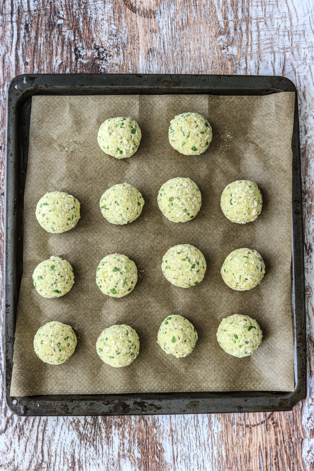 2. . . . in zweiter Linie verzichte ich auf das Frittieren der Bällchen in Butterschmalz, der Einfachheit halber backen wir diese kurzerhand im Backofen und vermeiden so vorteilhafterweise auch herumspritzendes Fett im Bereich des Herdes.