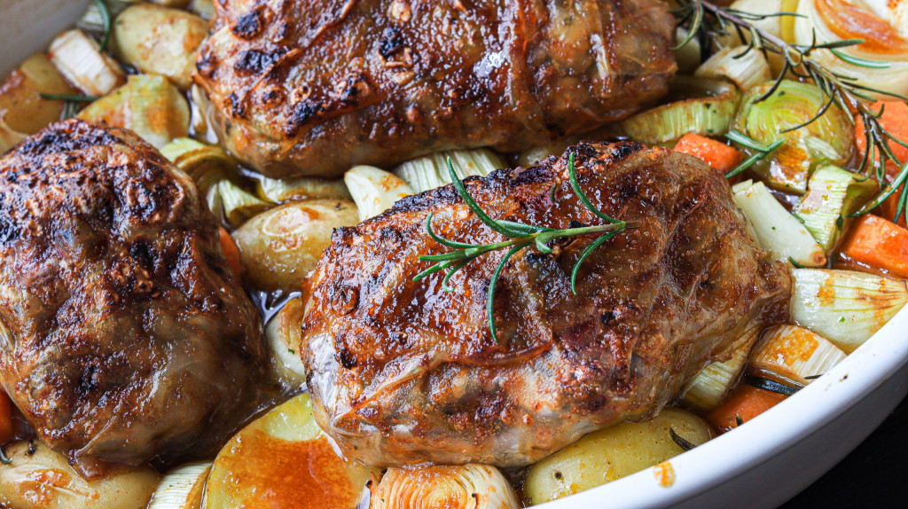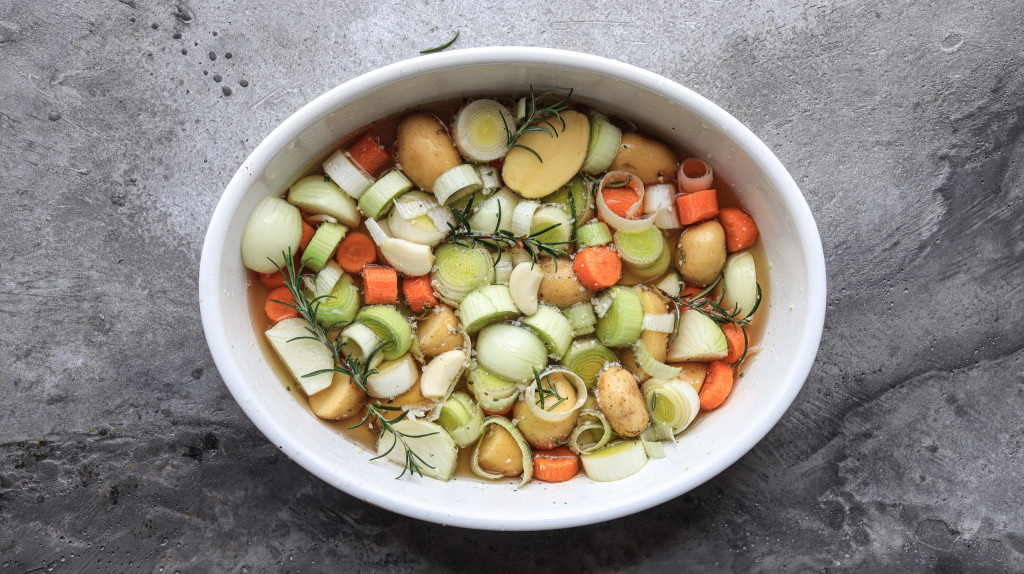 Nehme eine Gratin,-oder Auflaufform und geb die Kartoffeln, Porree, Rosmarin, Zwiebel, 2 Knoblauchzehen und Karotten in die Form und giesse 400ml Brühe und 1 EL Rapsöl darüber.