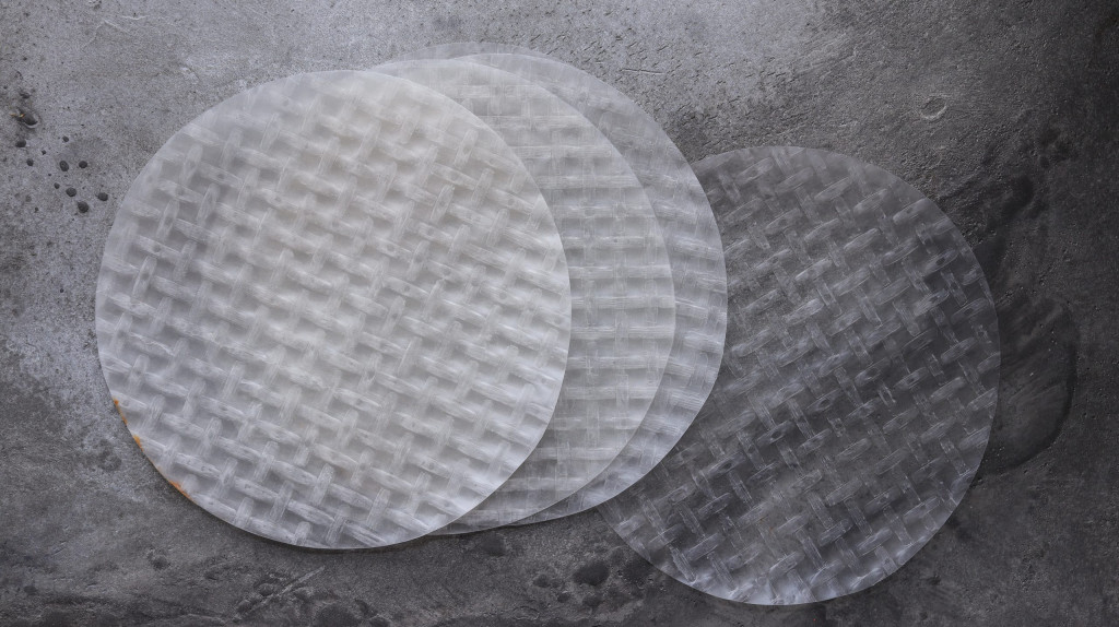 klingt mir persönlich zu tierisch, ist aber ja am Ende so. (grins) Unsere Haut besteht aus Reispapier. Fast zu simpel, um wahr zu sein. Reispapier könnt ihr mittlerweile in jedem gut sortierten Supermarkt finden. Edeka, Kaufland, Denns oder auch Alnatura haben sie auf jeden Fall im Sortiment. Und selbstverständlich wird euer Asiate von nebenan sie parat haben. Reispapier wird vor der Verarbeitung in heissem Wasser eingeweicht. Dazu nehmt ihr euch eine etwas grössere Schüssel oder Teller und füllt heisses Wasser hinein. Nun legt ihr das Reispapier hinein und drückt es etwas ins Wasser. In etwa einer Minute sollte es weich sein und kann (in unserem Fall) einfach auf eine glatte Arbeitsfläche gelegt werden.