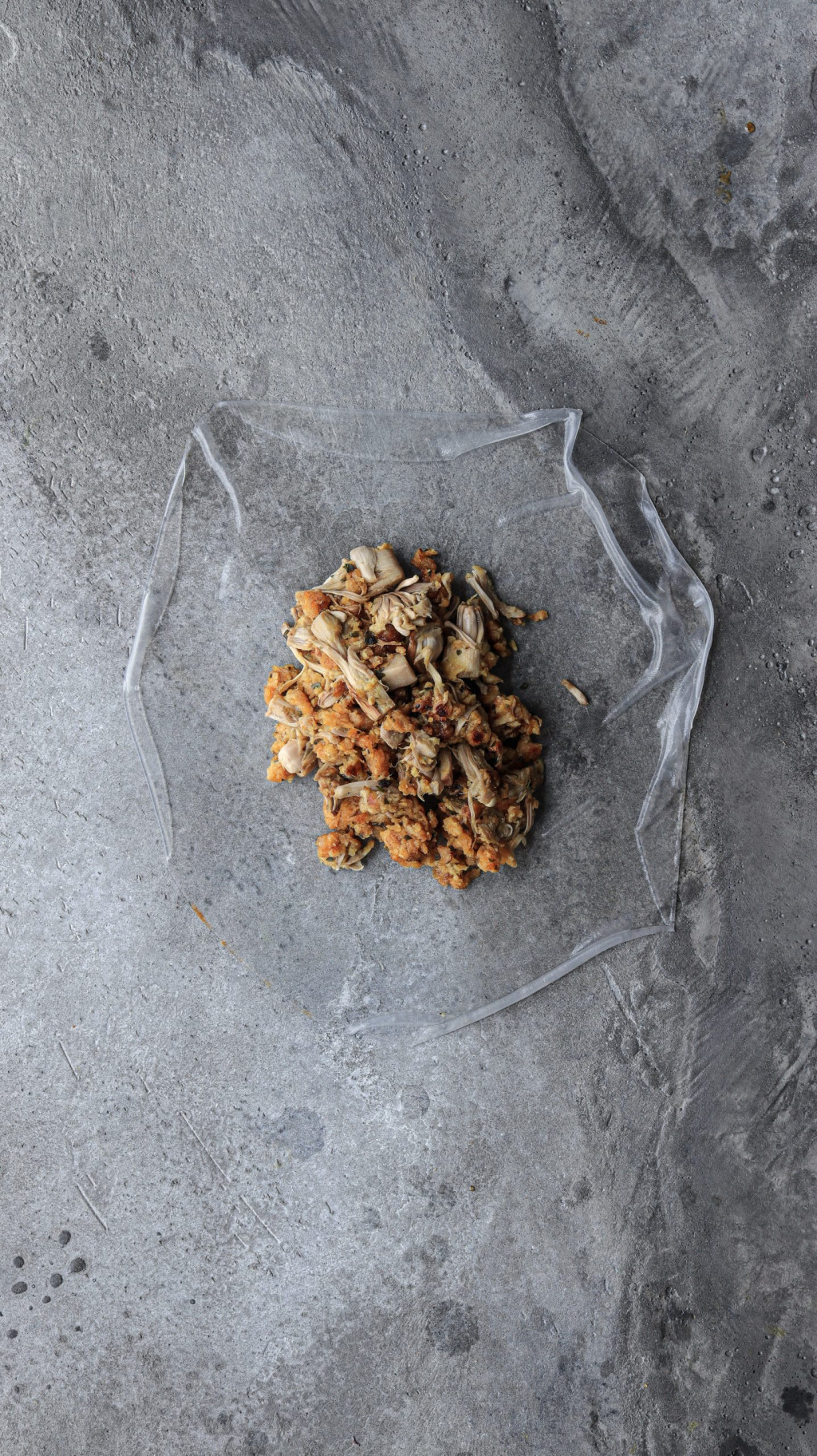 Nimm ein Reispapier und wende es in heissem Wasser, bis es weich ist. Leg es auf eine glatte Oberfläche und platziere 3-4 EL deiner Füllung. An dieser Stelle formst du deine Hähnchenschenkel.