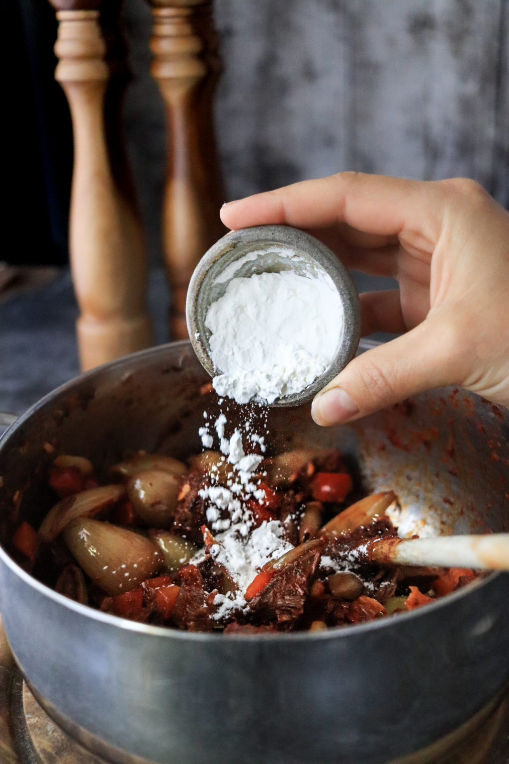 Im Grunde werden unsere Schalotten und der Knoblauch, gemeinsam mit dem Majoran, der Jackfruit und dem geräucherten Paprikapulver angebraten, um dann mit der Speisestärke vermengt zu werden. Nun können die Flüssigkeiten auch schon aufgegossen werden, damit das fröhliche Einkochen starten kann. Ich empfand den Geschmack nach 40 Min Einkochzeit optimal. Ihr könnt hier (je nachdem, wie viel Alkohol ihr auskochen wollt, – bzw. wie intensiv ihr den Sossengeschmack wollt) die Kochzeit anpassen.