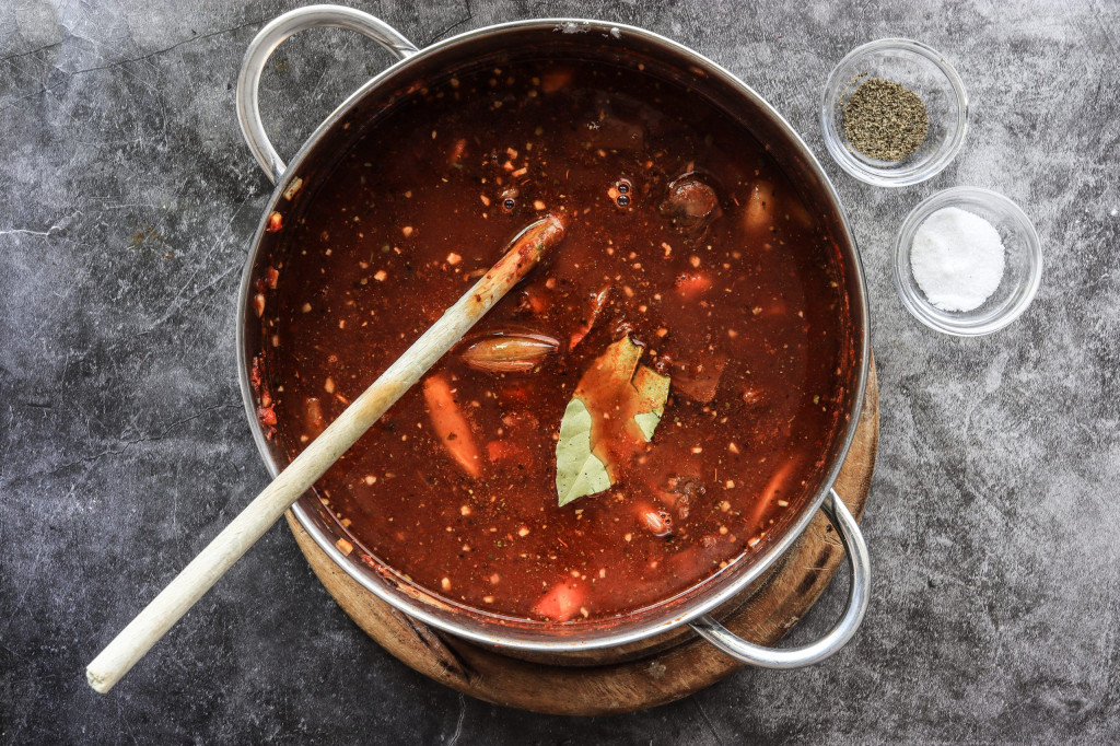 Nun löschst du mit den Flüssigkeiten ab. Gibst etwas Salz, Pfeffer und das Lorbeerblatt in die Sosse und köchelst alles 35-40 Min.