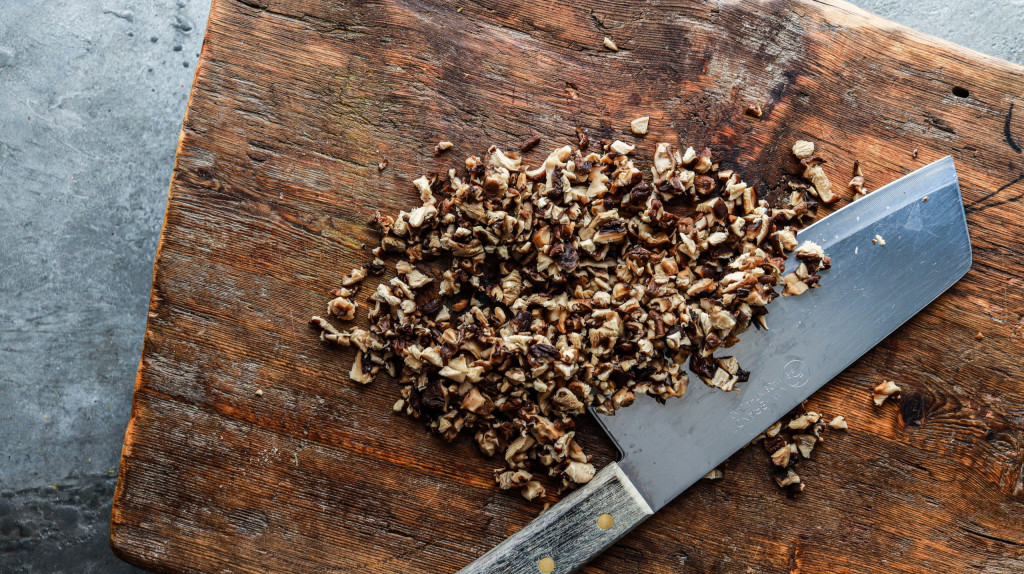 Um einen authentischen Biss und eine angenehm-kaubare Textur zu erhalten, hacke ich die Pilze nach dem Einweichen ziemlich fein. Es ist darauf zu achten, sie nicht zu klein zu hacken, um die Stückchen nachher noch beim Kauen zu spüren (denn sie geben einen tollen Biss), aber nicht so gross, dass sie sich nicht mehr gut in die Masse einfügen. Beim Braten würde unser Schnitzel dann auseinanderfallen. Wäre schlecht!