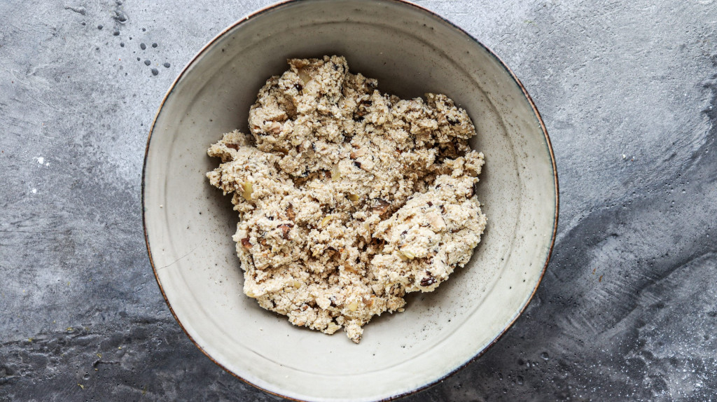 Gib Beides mit den restlichen Zutaten für die Schnitzel in eine Schüssel und vermenge alles gut miteinander. Zerdrücke den Tofu dabei so gut wie möglich. Die Masse muss richtig zusammenkleben und der Tofu fein zerkrümelt sein