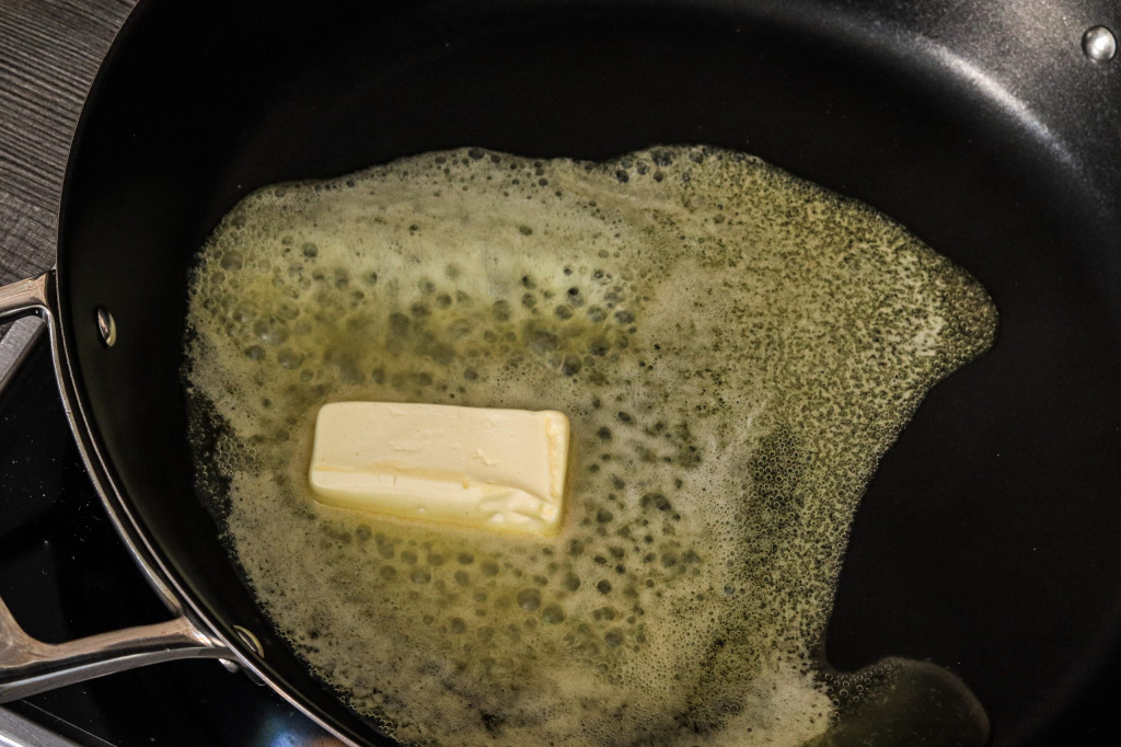 Nun gehts ans Anbraten. Mein persönlicher Lieblingpart der Kochtätigkeiten. Wir erhitzen 80g vegane Butter. Ich verwende sehr gern den vganen Block Butter von Naturli. Hier findet sich kein Palmfett und auch von sonstigen E-Stoffen keine Spur.