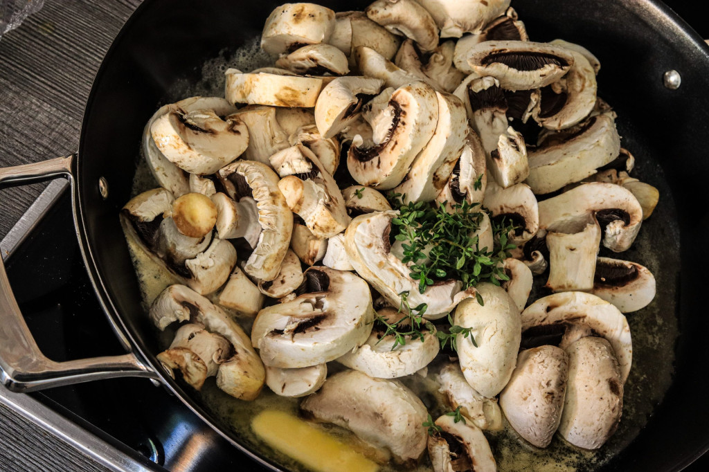 Sobald die Butter heiss ist, könnt ihr die Pilze hinzugeben und euch für ca. 8 Min entspannen. Das Köpchen hat jetzt nämlich ein wenig Ruhe, bis der Bratvorgang abgeschlossen ist und eure Pilze anfangen zu bräunen. Dies dauert bei hoher Hitze etwa 8 Min.